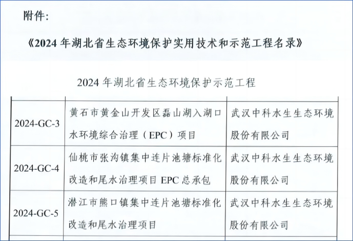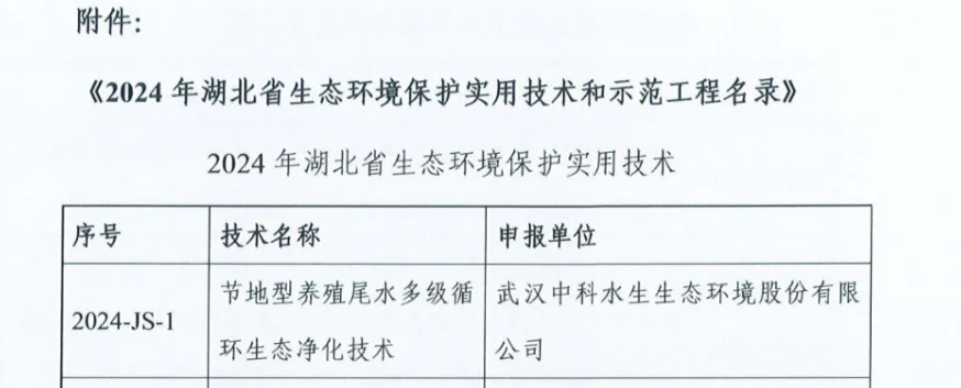 近日,湖北省環保產業協會公布了《2024年湖北省生態環境保護實用技術和示范工程名錄》,武漢中科水生申報的“節地型養殖尾水多級循環處理技術”、黃石市黃金山開發區磊山湖入湖口水環境綜合治理(EPC)項目、潛江市熊口鎮集中連片池塘標準化改造和尾水治理項目、仙桃市張溝鎮集中連片池塘標準化改造和尾水治理項目EPC總承包成功入選該示范工程名錄。