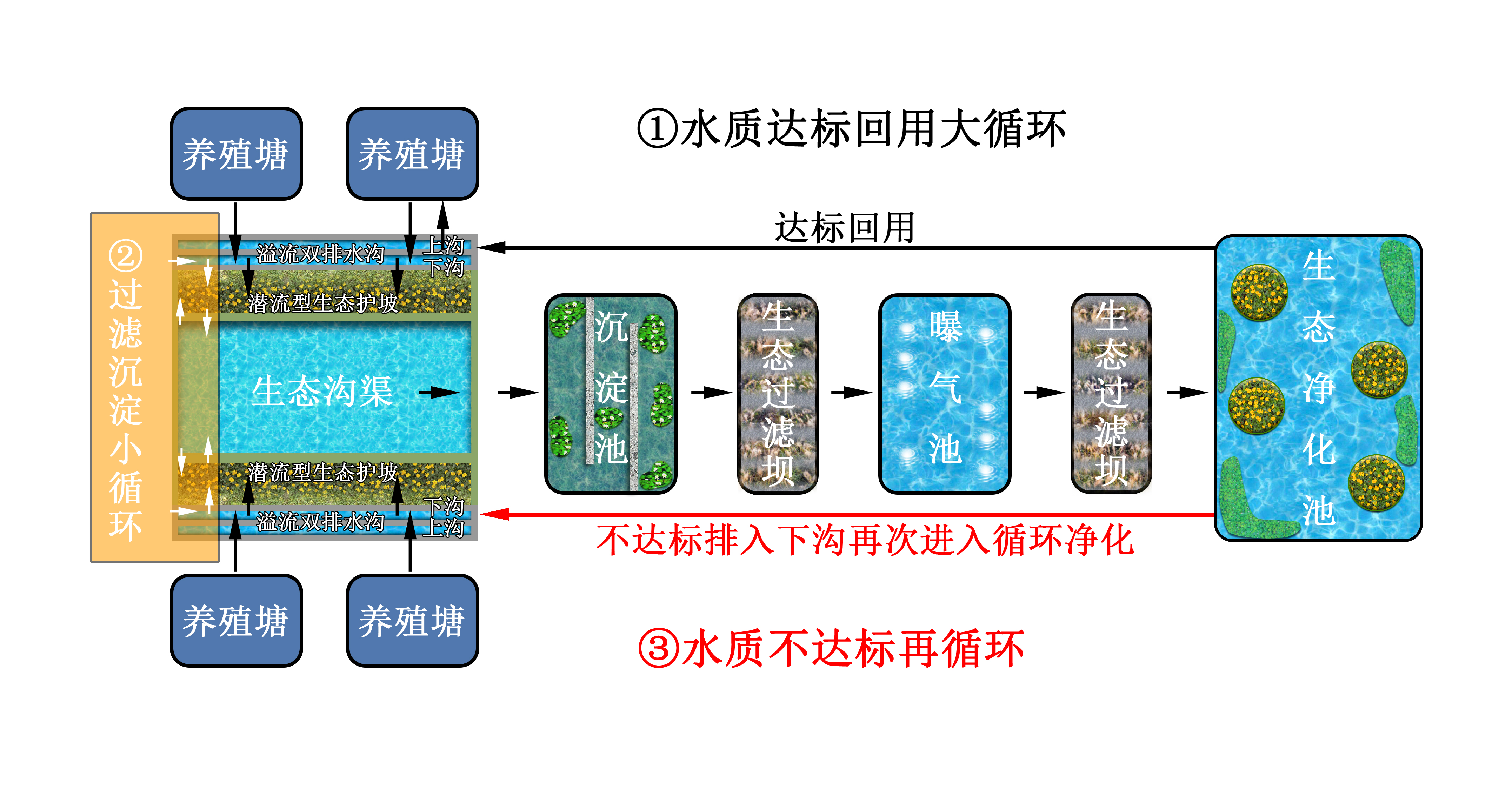 仙桃市張溝鎮集中連片池塘標準化改造和尾水治理項目主要以仙桃市張溝鎮為項目建設區,涉及三同村、西堤村、先鋒村、旭灣村、朱坊村、周家灣村等六個村鎮,處理集中連片池塘面積為10520畝,處理規模為8萬m3/d。該項目創新使用“溢流型雙排水溝+潛流型生態護坡”工藝和“節地型養殖尾水多級循環處理技術”,主要通過排水溝渠生態化改造、“Z”字形擋水設施、生態過濾壩設置進行尾水治理設施、池塘標準化改造及配套設施。削減水產養殖排入的污染物,配套養殖場綠化和景觀,實現養殖尾水的生態化處理,使養殖尾水水質達到《淡水池塘養殖水排放要求》(SC/T9101-2007)二級標準。該項目實施讓張溝鎮先鋒村及其周邊村鎮水產養殖池塘得以標準化改造,養殖尾水得到綜合治理,污染負荷得到有效削減,保障了排水水質達標,改善了區域內水生態環境。