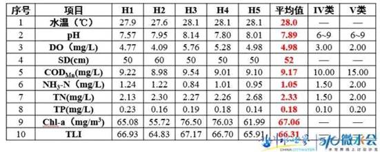 濱湖水體為地表水劣V類,其主要超標污染物為總氮和總磷,由綜合營養狀況指數(TLI)可看出,水體處于中度富營養狀態。