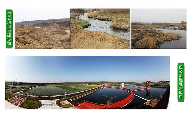 我公司承建的晉城市巴公河人工濕地(2014-2015設計施工總承包、運營)處理對象為巴公河受污染河水,處理規模按3萬m3/d設計實施;建設內容包括:積水緩沖池、進水格柵渠、沉淀池、表面流人工濕地、垂直流人工濕地、出水泵房、儲泥池、污泥濃縮脫水車間、監測室、防洪擋墻、大門圍墻、道路、景觀及其它附屬配套設施等。本工程實施后,可為丹河龍門濕地公園提供3萬m3/d的生態景觀用水。
