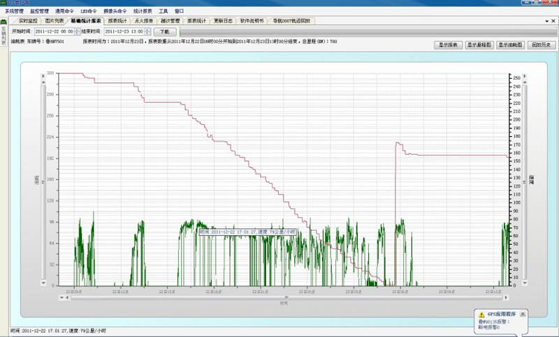 油量统计列表中可清晰看到车辆行驶速度,油量也是慢慢往下耗的,中间还加了一次油。这些都可以在电脑上精确的统计出来。简单易懂,方便调度和管理。为公司的管理提供了很大的方便。