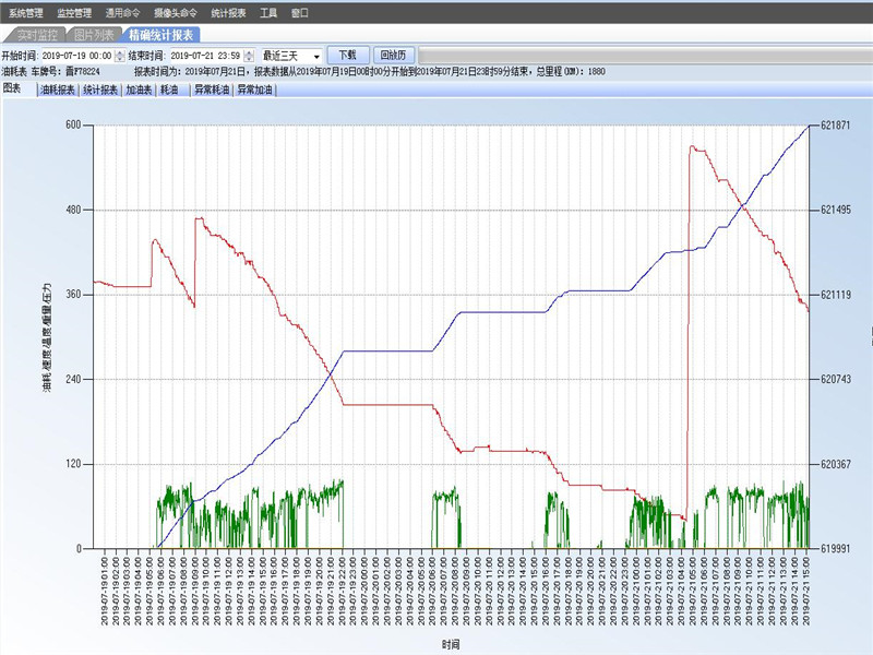 油耗统计:实时检测油量,防止司机私自倒卖油料。(需要加万能油量传感器)单次加油误差小于3升。系统可生成里程、速度、油耗对应表。